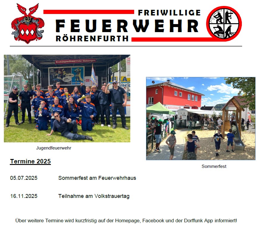 - Die Jugendfeuerwehr trifft sich jeden Dienstag um 18 Uhr im Feuerwehrgerätehaus. Bei Interesse einfach vorbei kommen oder über Email Kontakt aufnehmen.